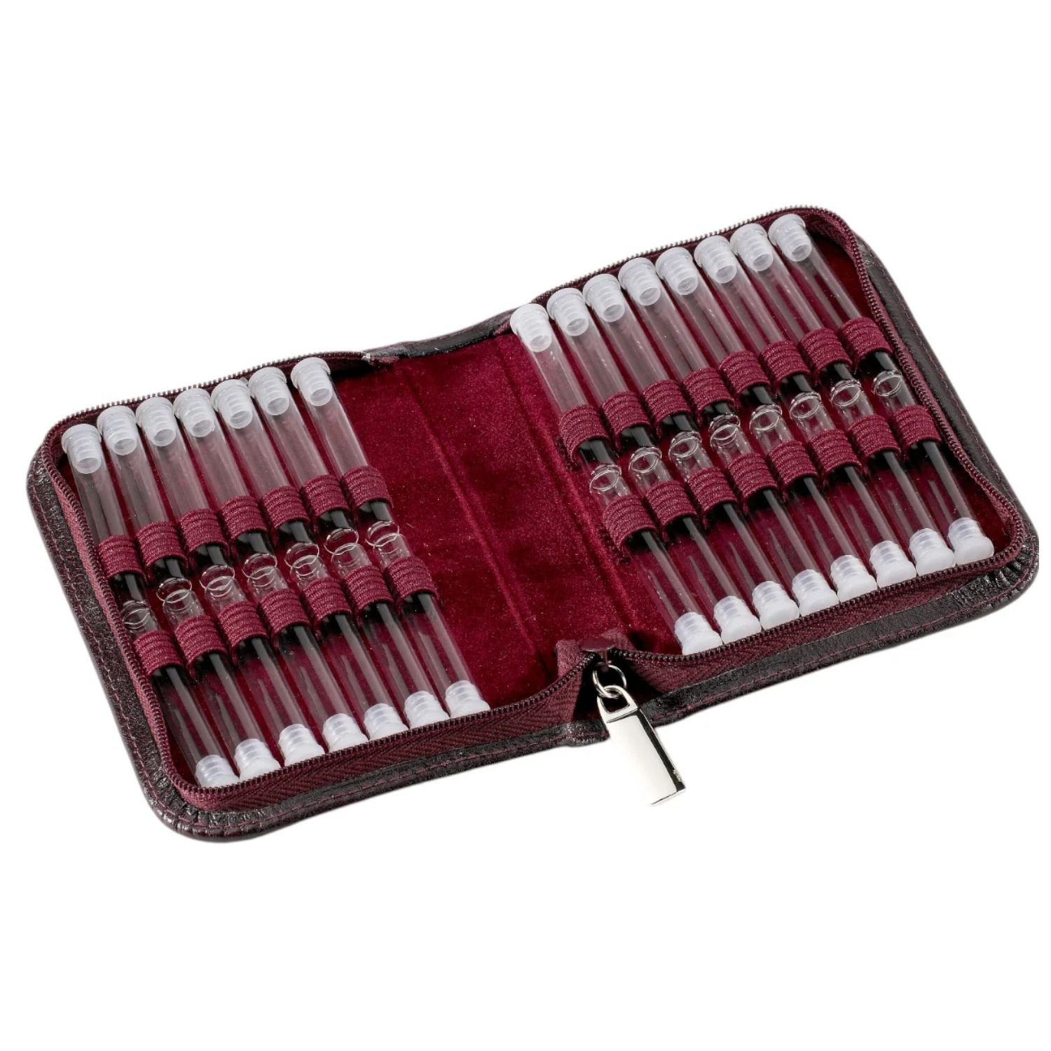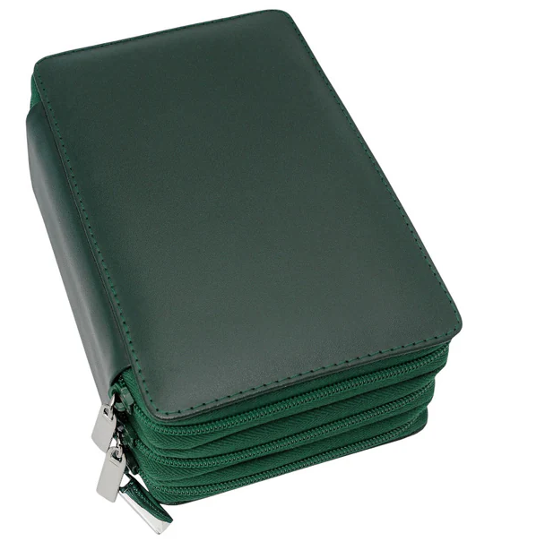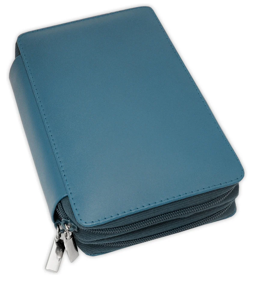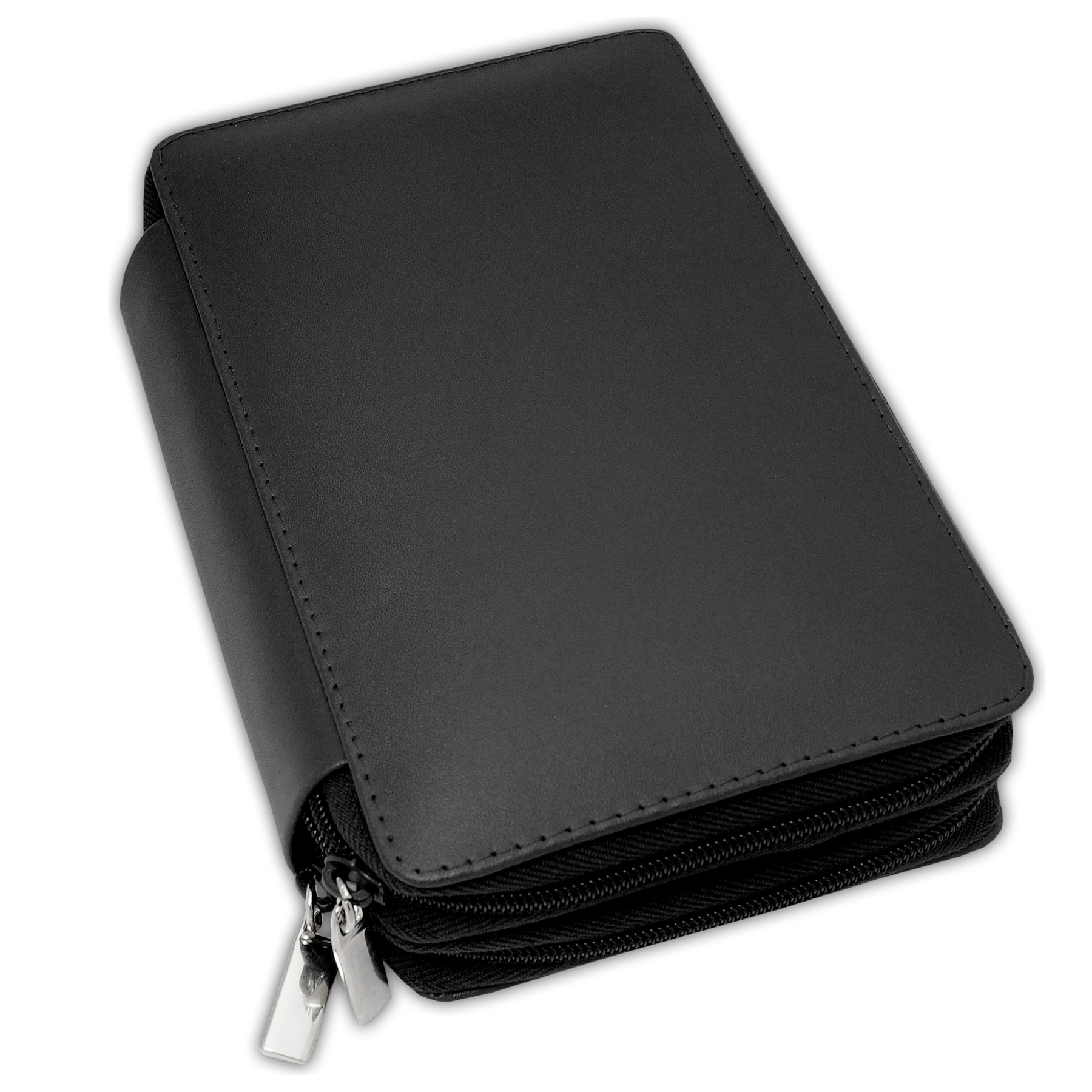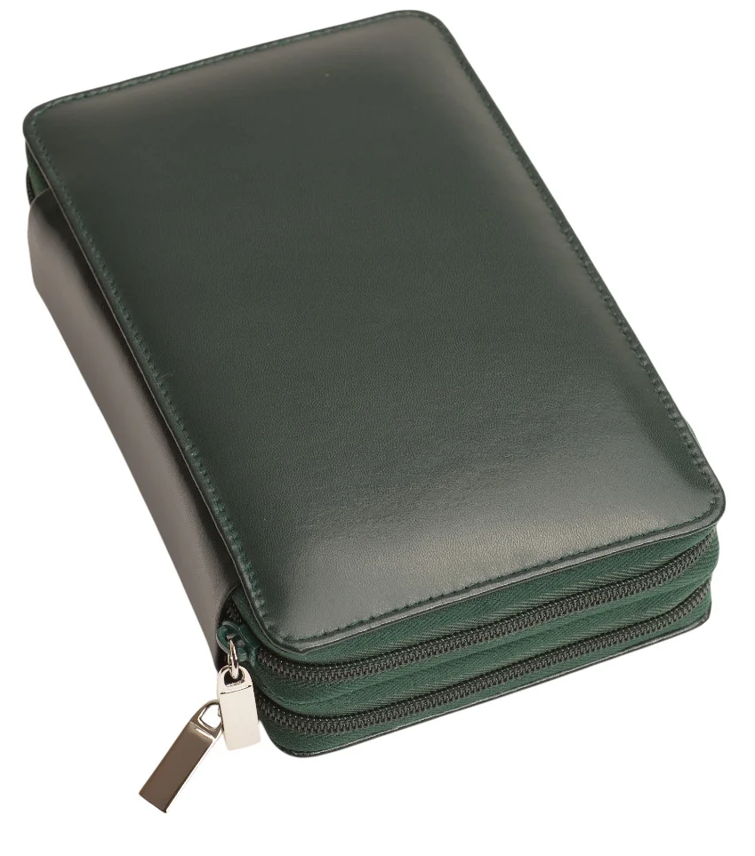 The inner lining is made of durable, fine fabric. The color-coordinated inner loops make it easy to insert the glasses. A durable zipper that matches the color of the leather ensures a secure closure. The chrome-plated zipper gives the bag a classy touch.